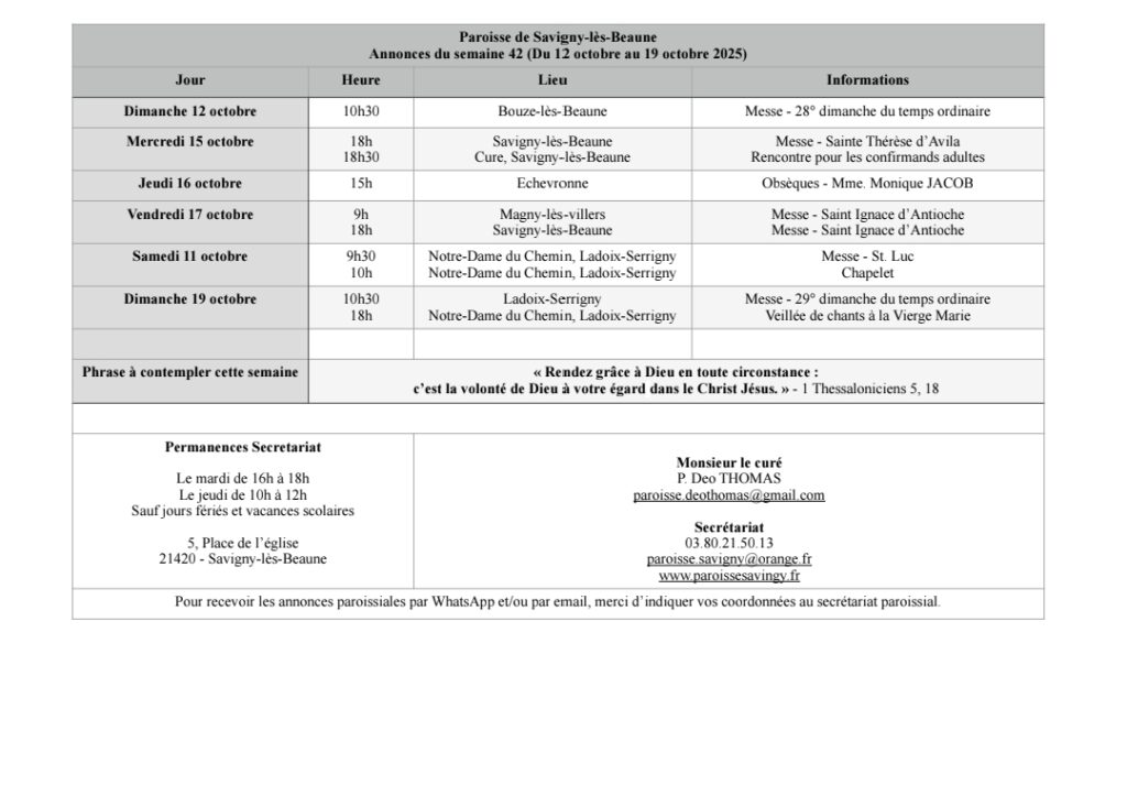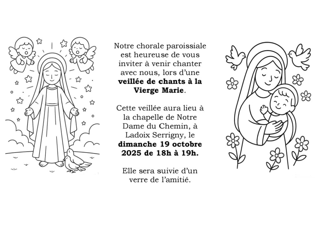 - les samedis matins 9h30 Chapelle Notre-Dame du chemin, Ladoix-Serrigny suivie à 10h00 par le chapelet pendant le mois du Rosaire (octobre) samedi 25 octobre exceptionnellement à 10h30.